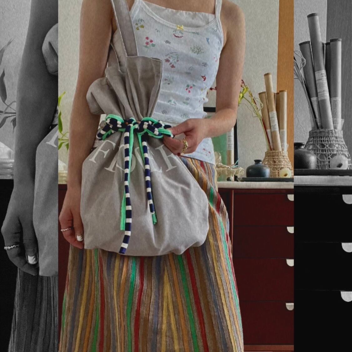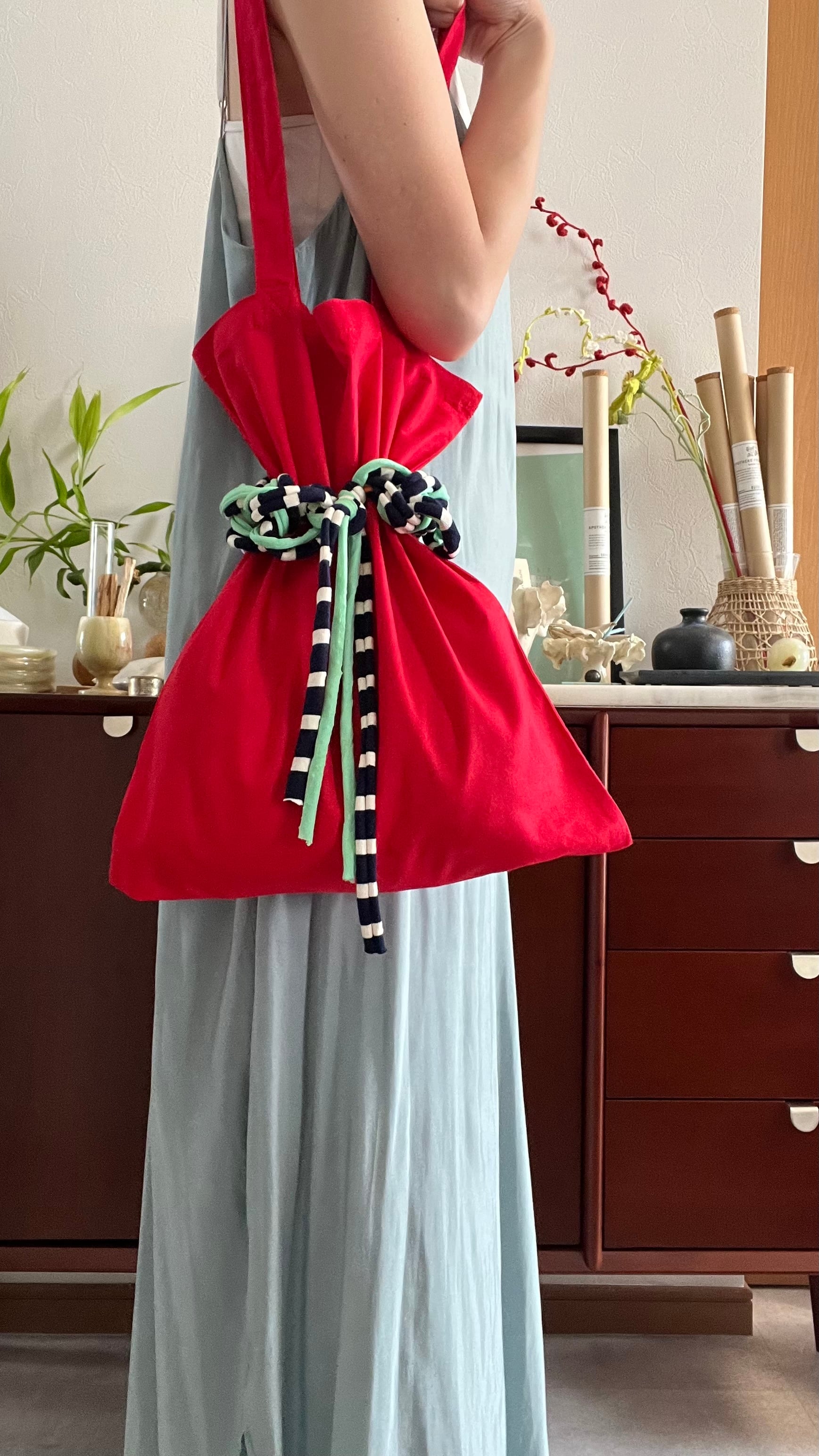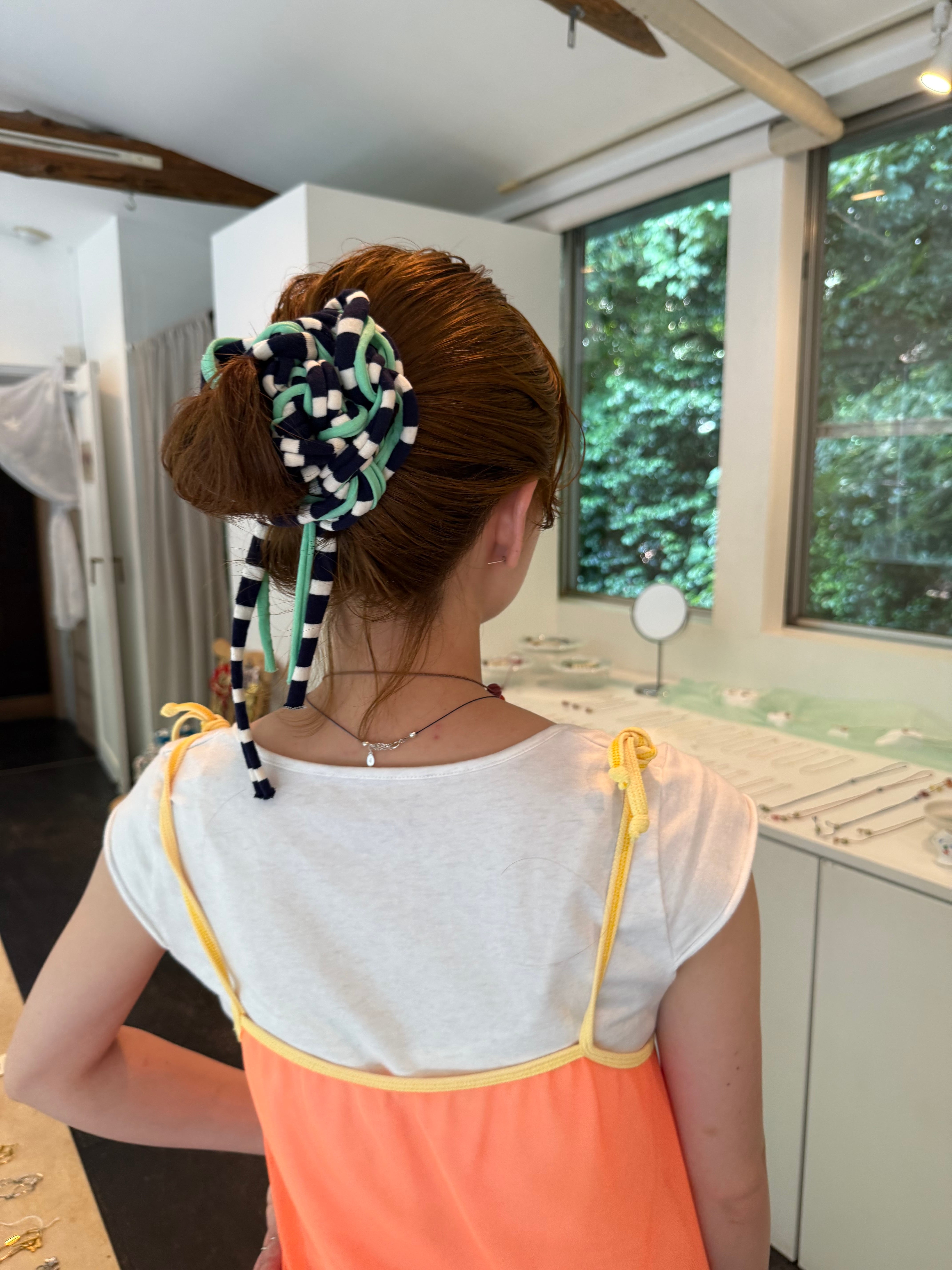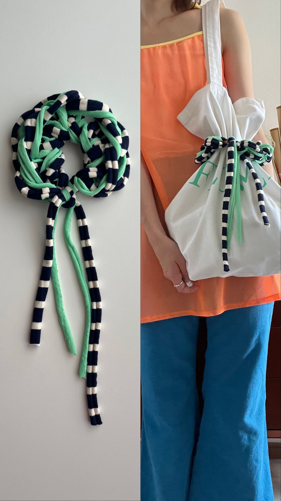 切り落としの生地の耳でラフにくしゅっと指編みで編み上げました。