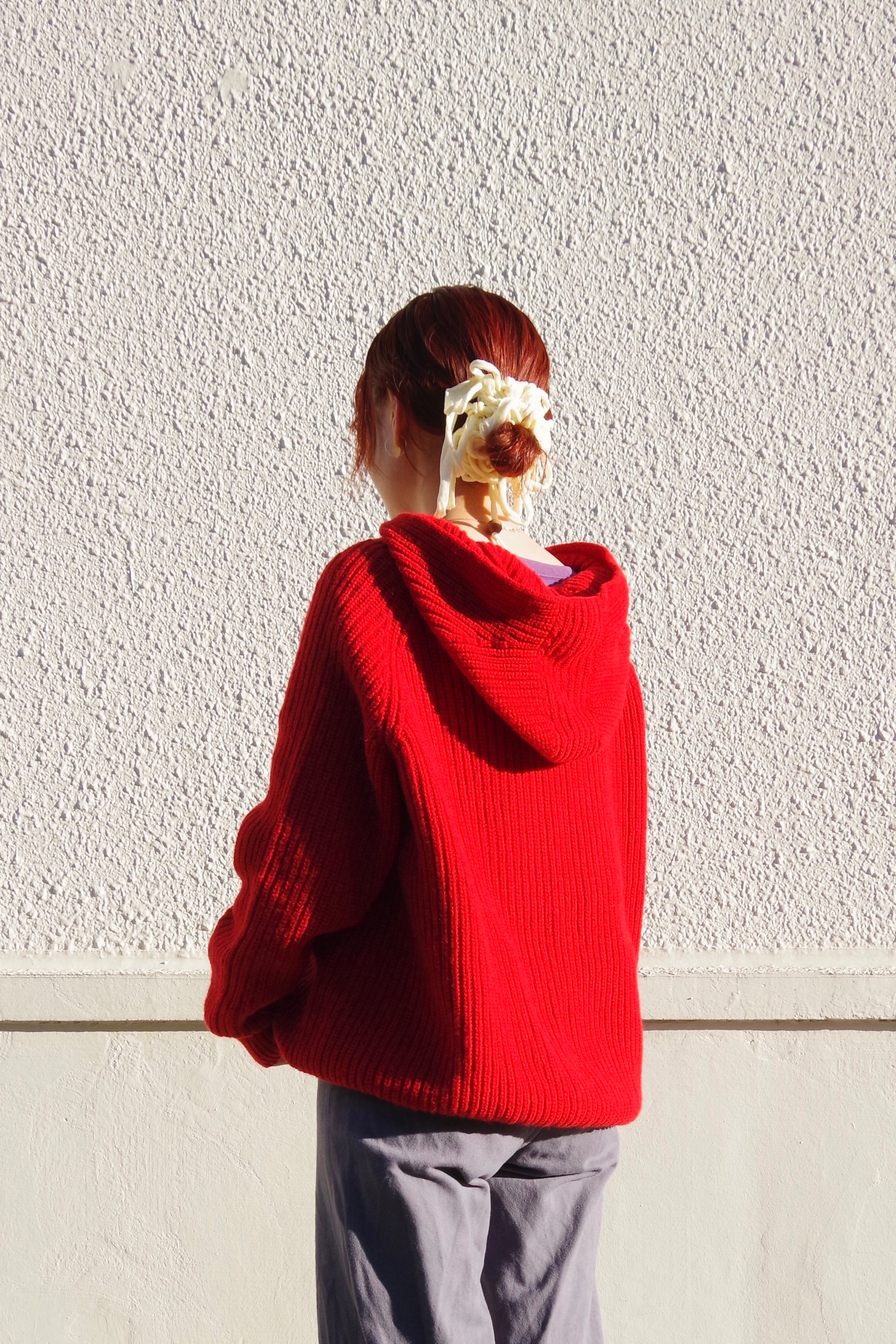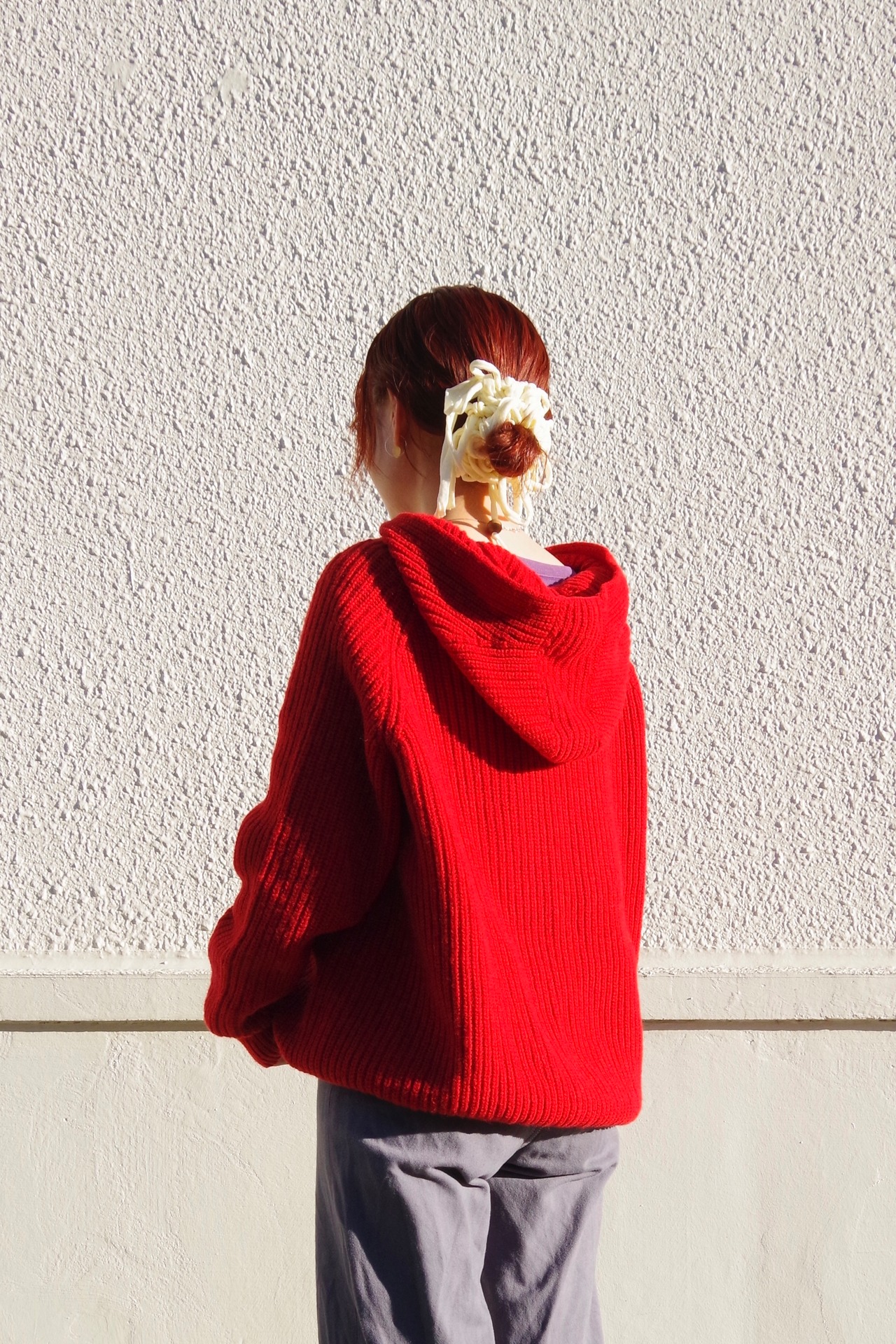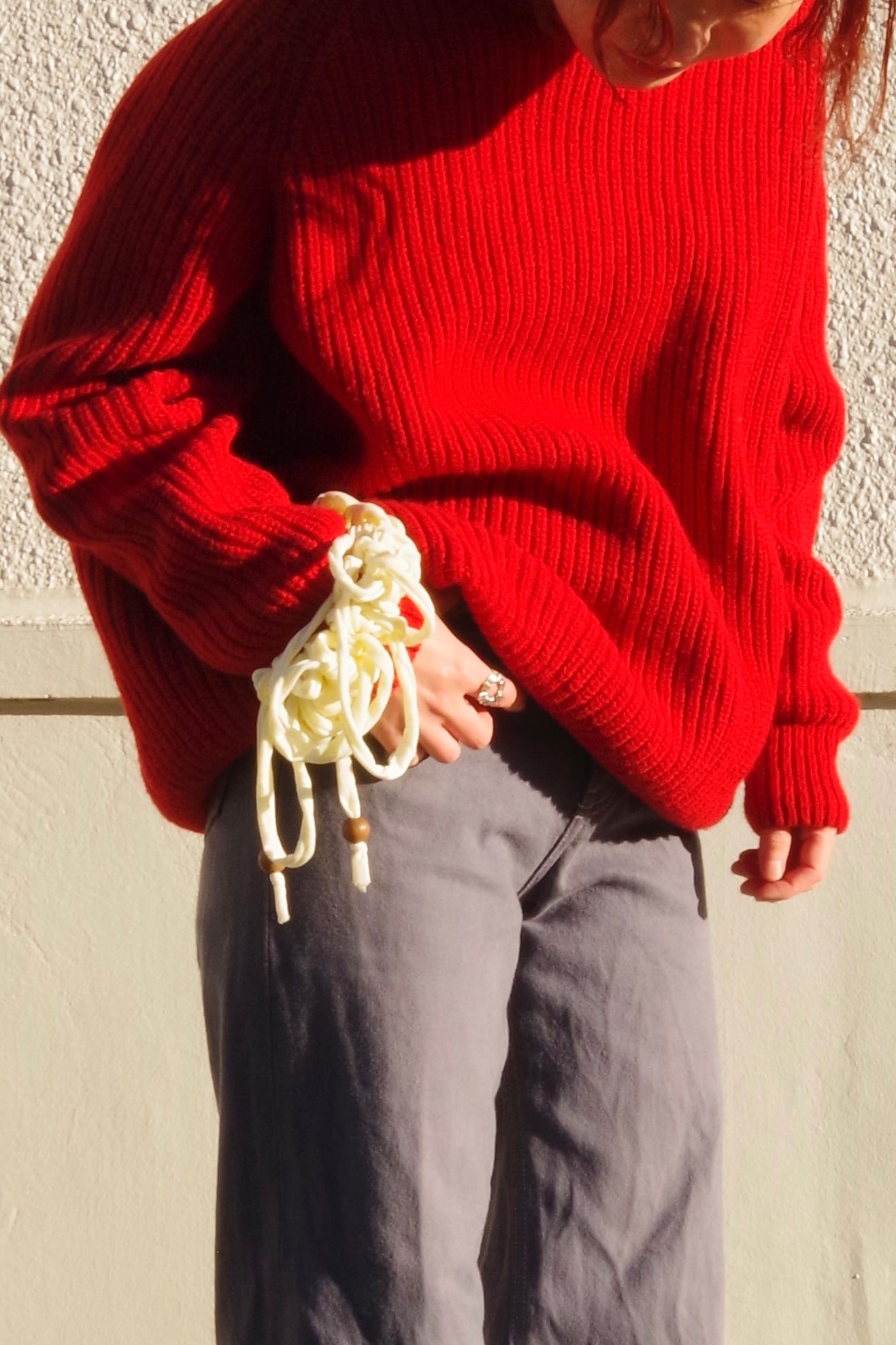 この極太の系は、切り落とされた布の耳を、新しい命を持った糸として再生させたサステナブルなファブリックです。