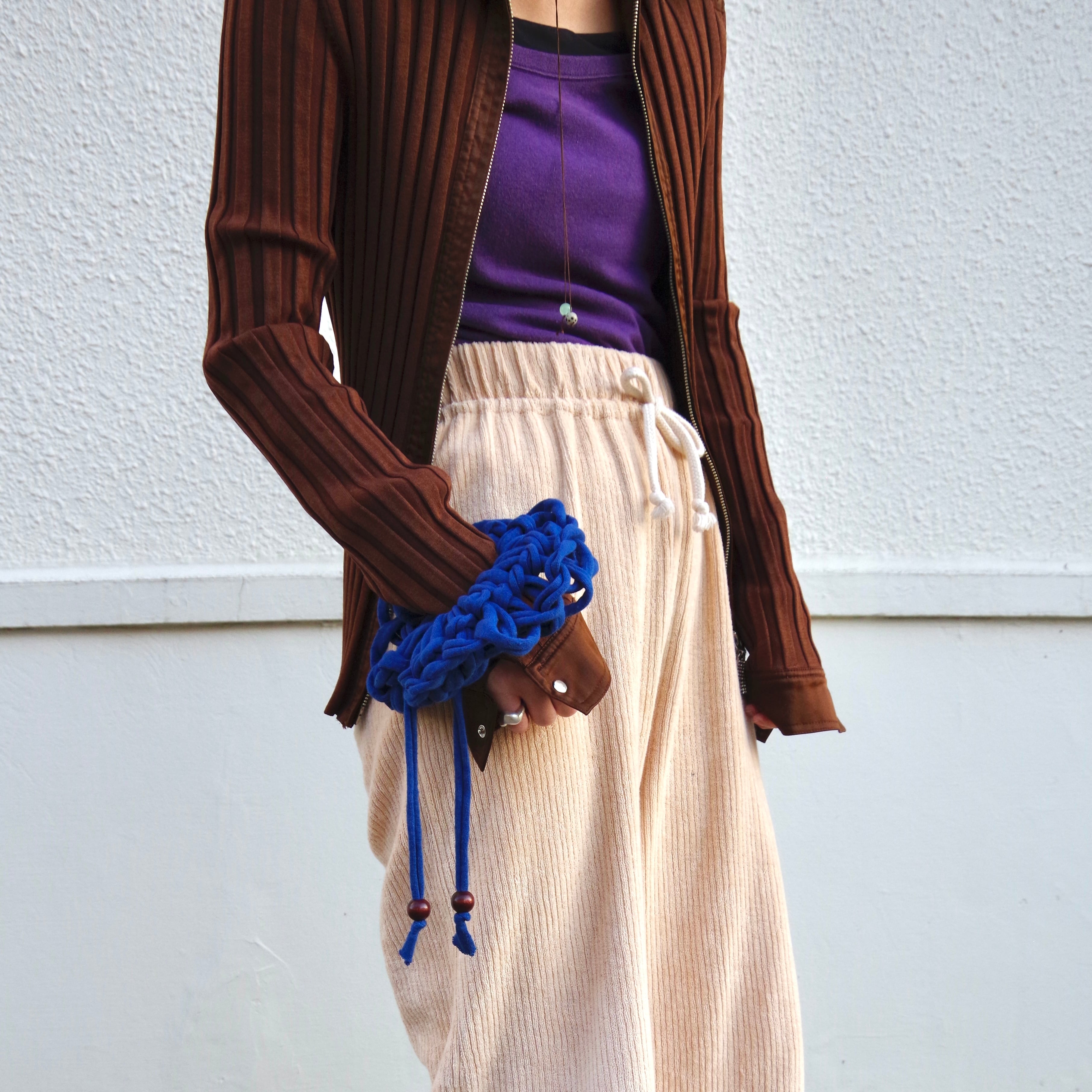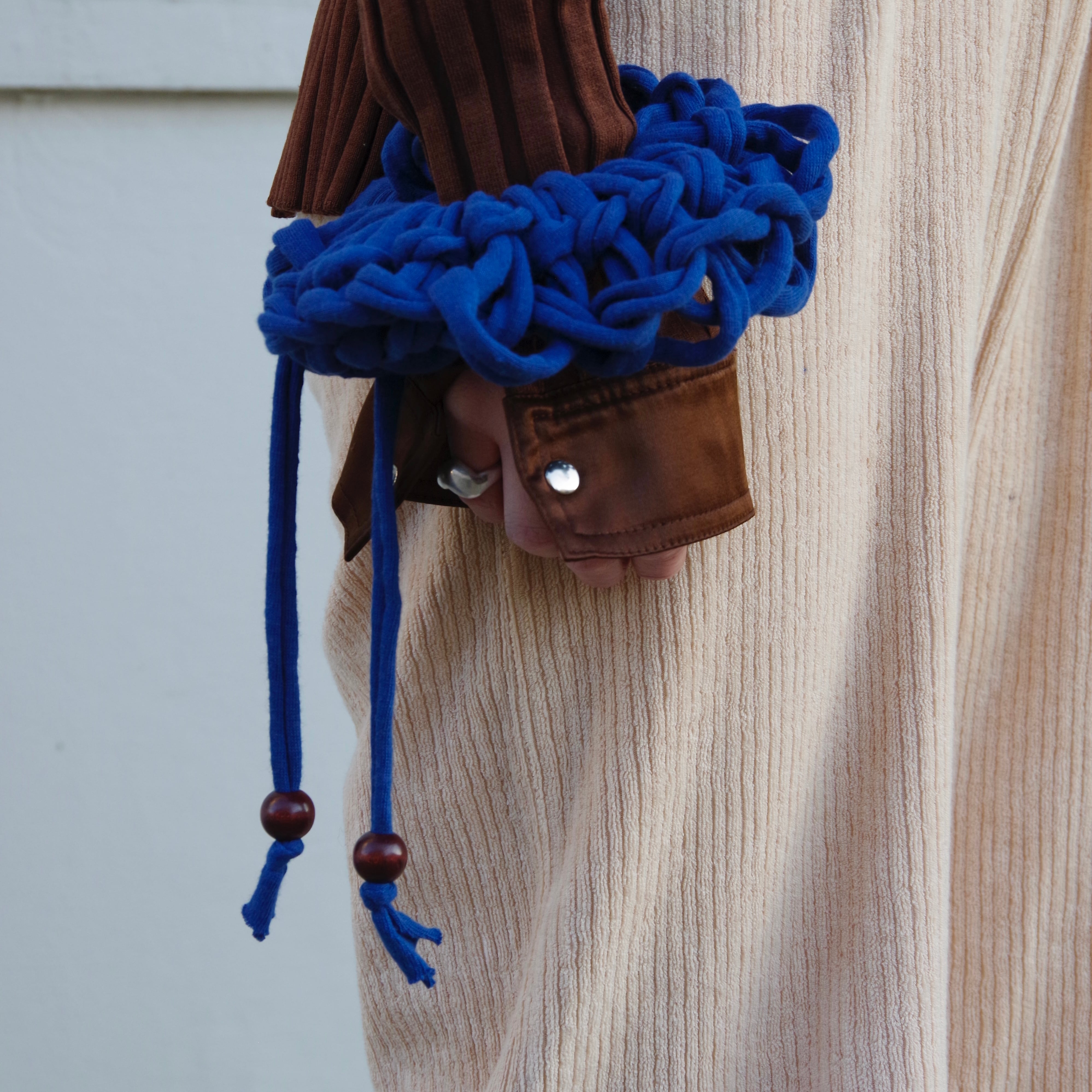 この極太の系は、切り落とされた布の耳を、新しい命を持った糸として再生させたサステナブルなファブリックです。