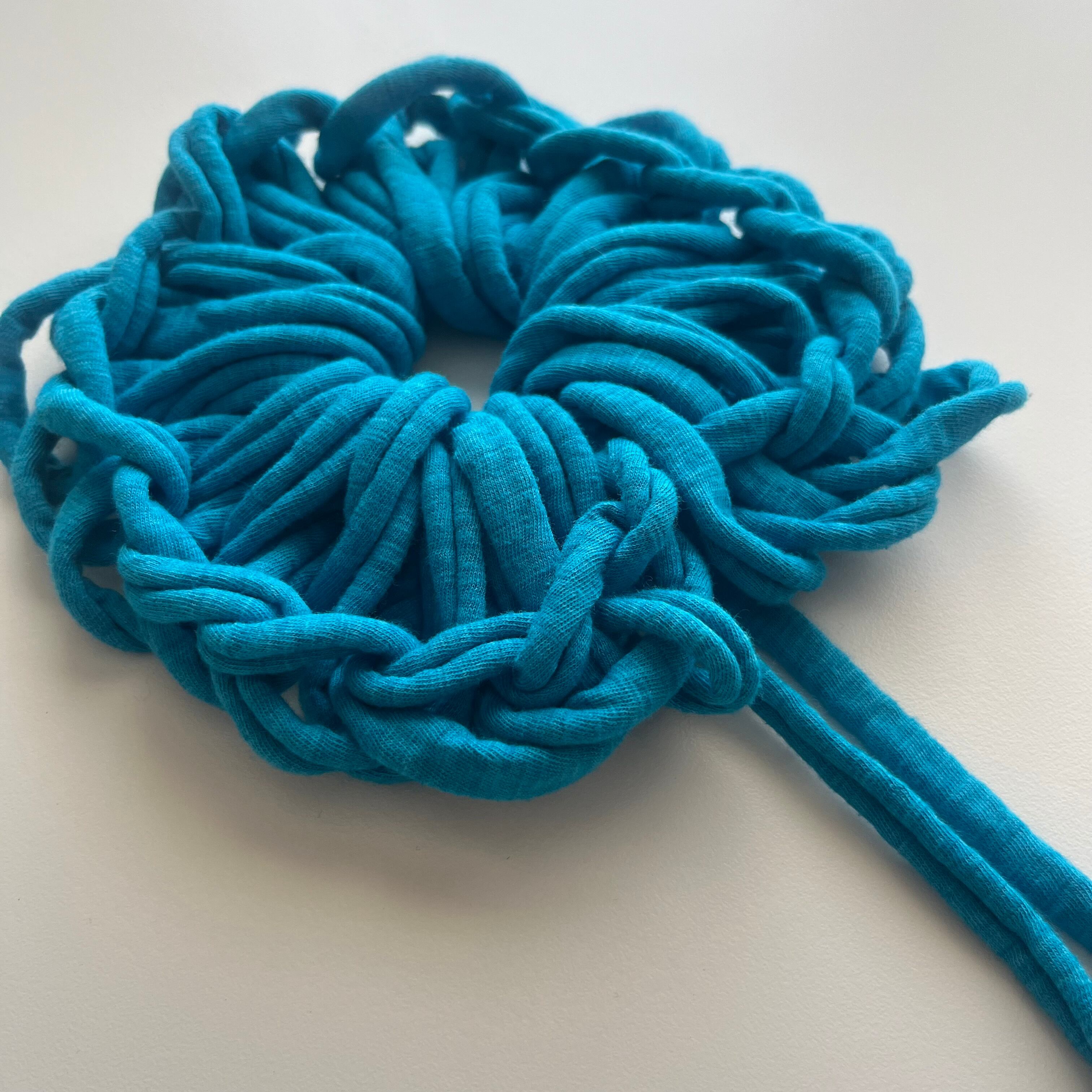 この極太の系は、切り落とされた布の耳を、新しい命を持った糸として再生させたサステナブルなファブリックです。