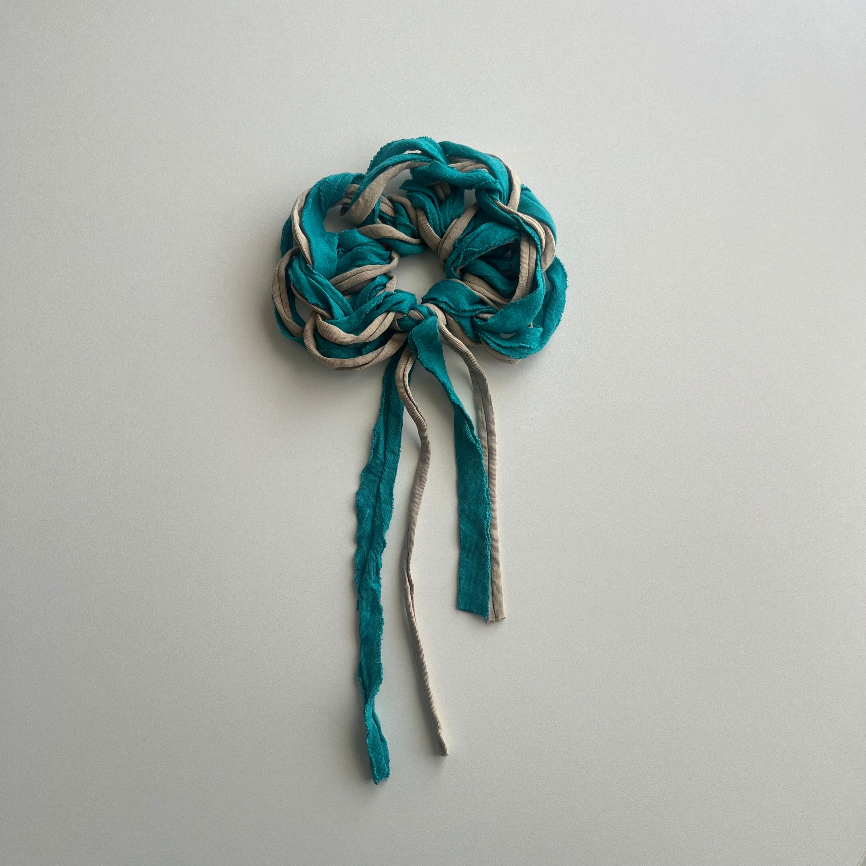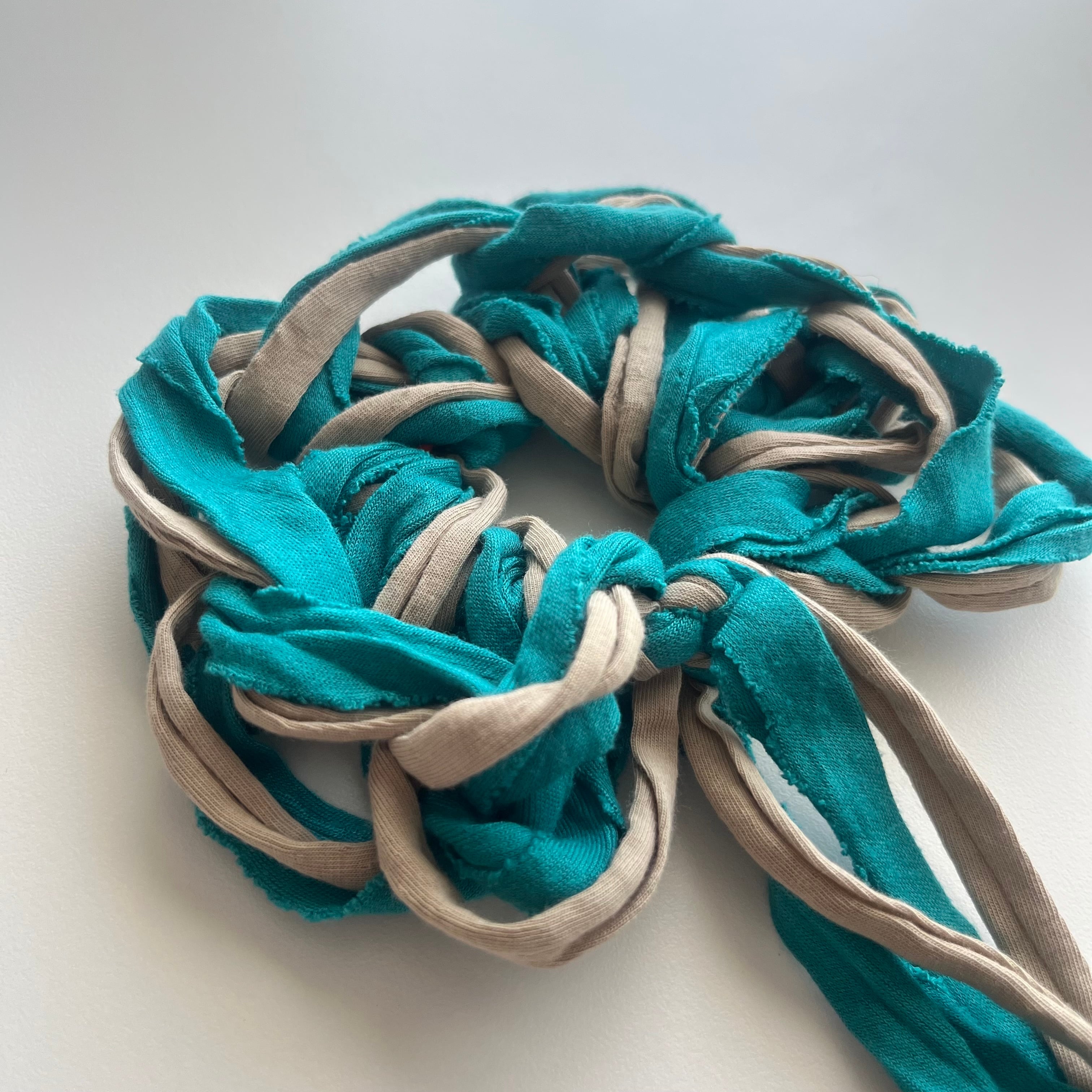 切り落としの生地の耳でラフにくしゅっと指編みで編み上げました。