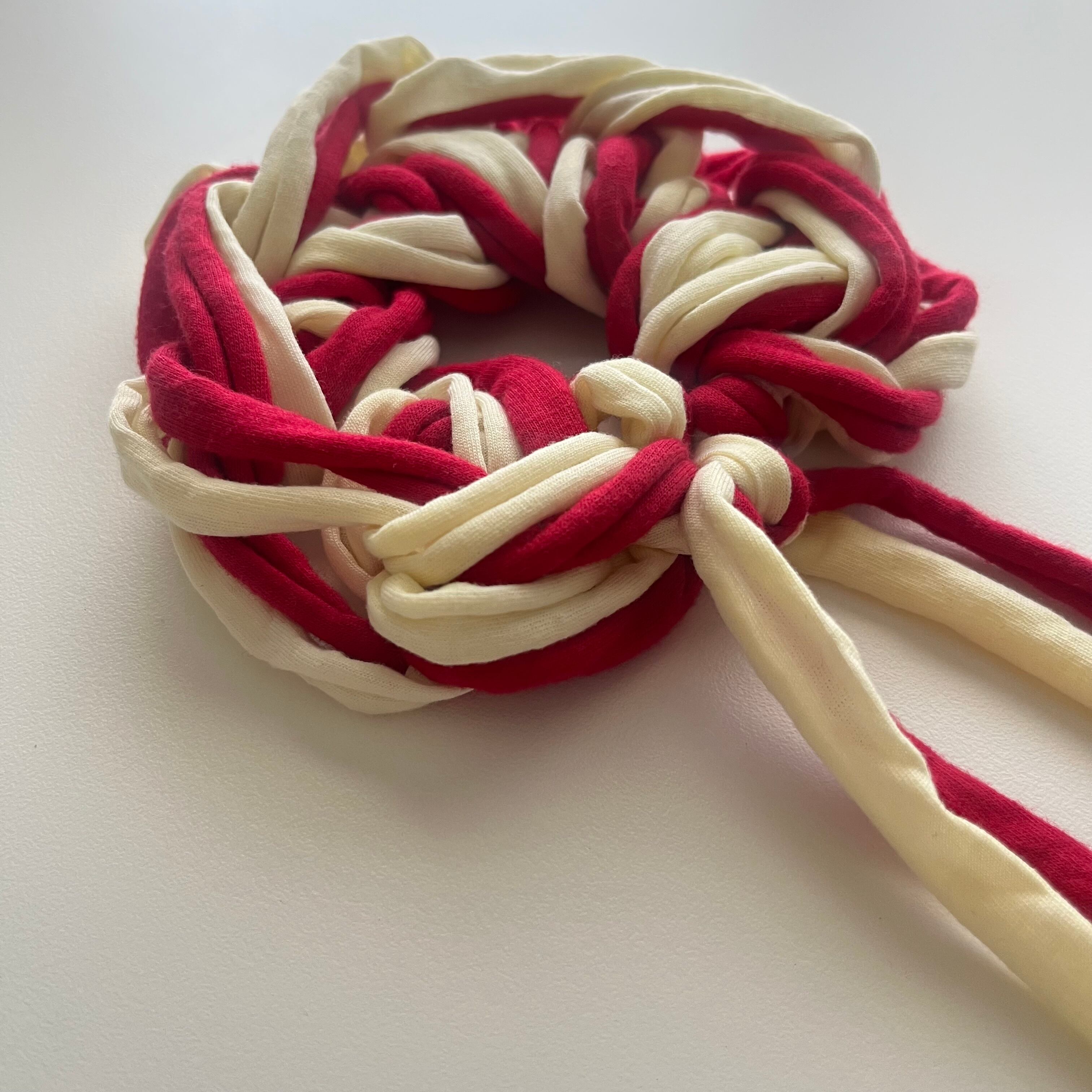 切り落としの生地の耳でラフにくしゅっと指編みで編み上げました。