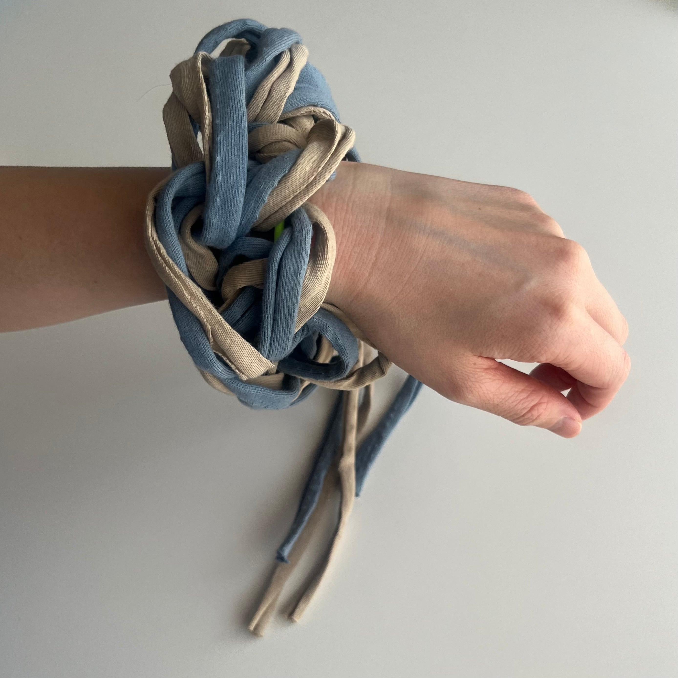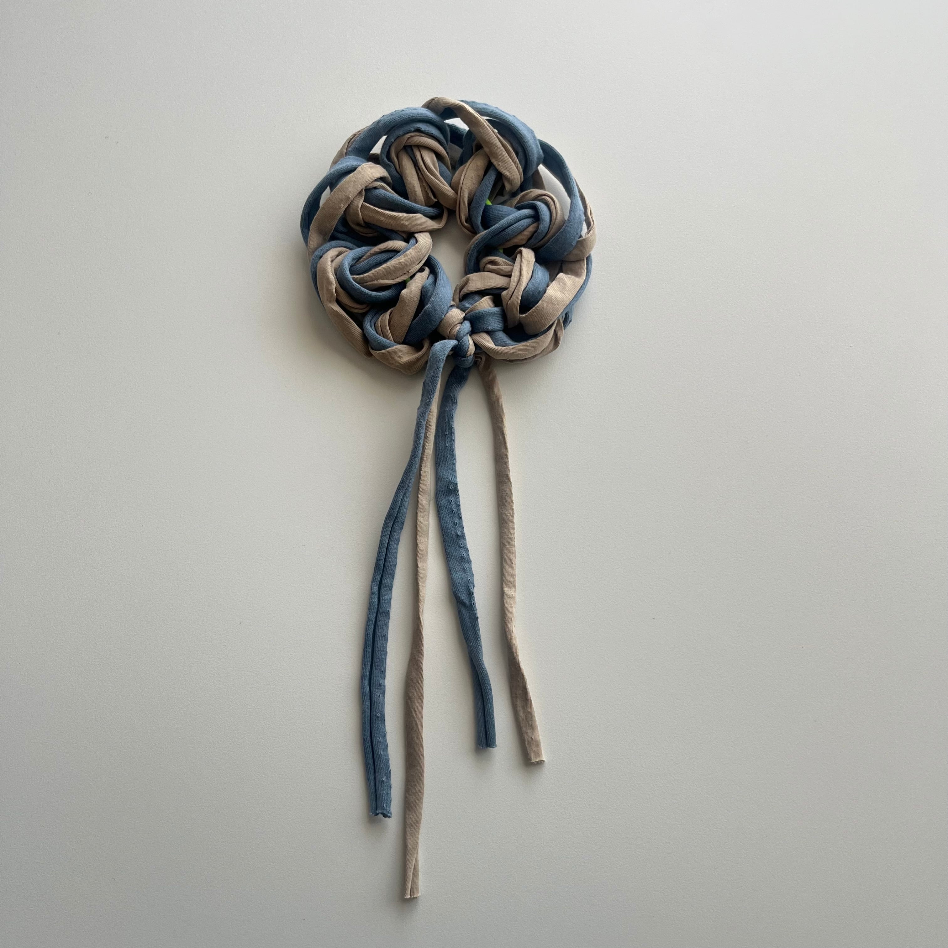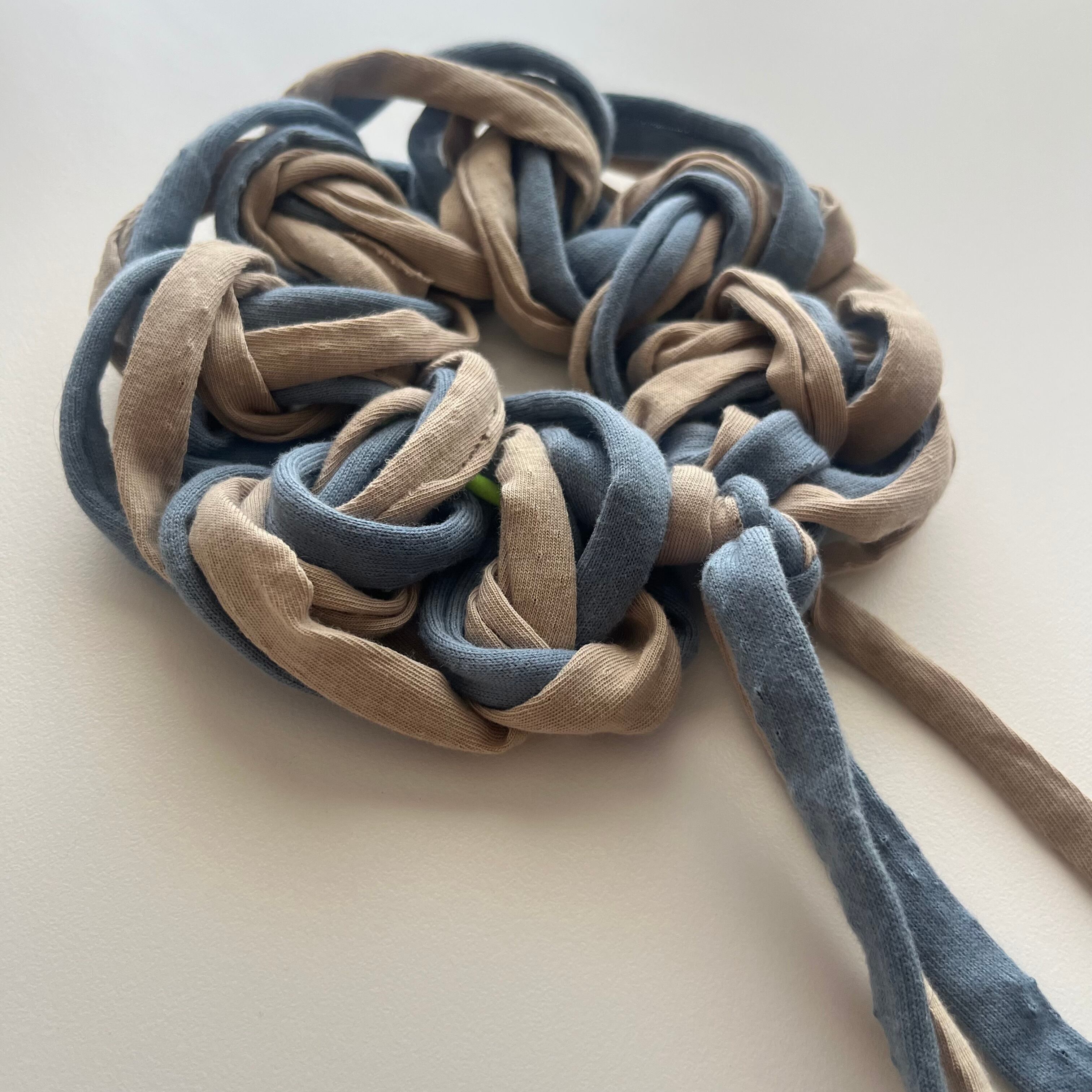 切り落としの生地の耳でラフにくしゅっと指編みで編み上げました。